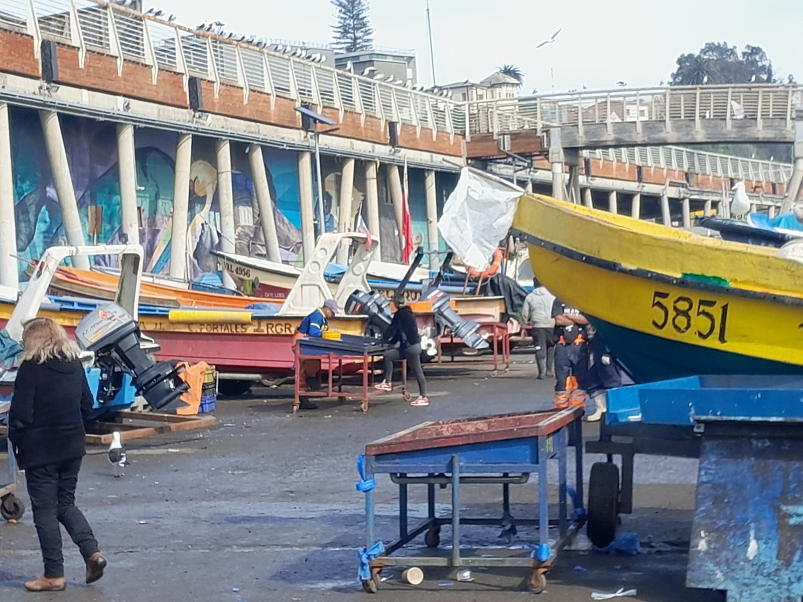 Une erreur de calcul nous a empêché de voir le musée archéologique ; dommage. Nous prenons un bus jusqu’à Valparaiso et avons la bonne idée de laisser nos grosses valises à la consigne de la gare routière… Nous devons reprendre un bus demain. Pour rejoindre le port, nous montons dans le trole. Mais au port nous ne trouvons pas les pélicans que nous recherchons. Il faudra reprendre un petit train jusqu’à la Caleta Portales. C’est un port de pêche et un marché des produits de la mer étonnant, où je ne reconnais pas la moitié des espèces. Nous regrettons de ne pas avoir une cuisine à notre disposition. Une jetée part du marché. Nous nous y aventurons et découvrons une colonie de loups de mer (ou otaries… mais on peut penser que chaque spécimen pèse entre 100 et 300 kilos).