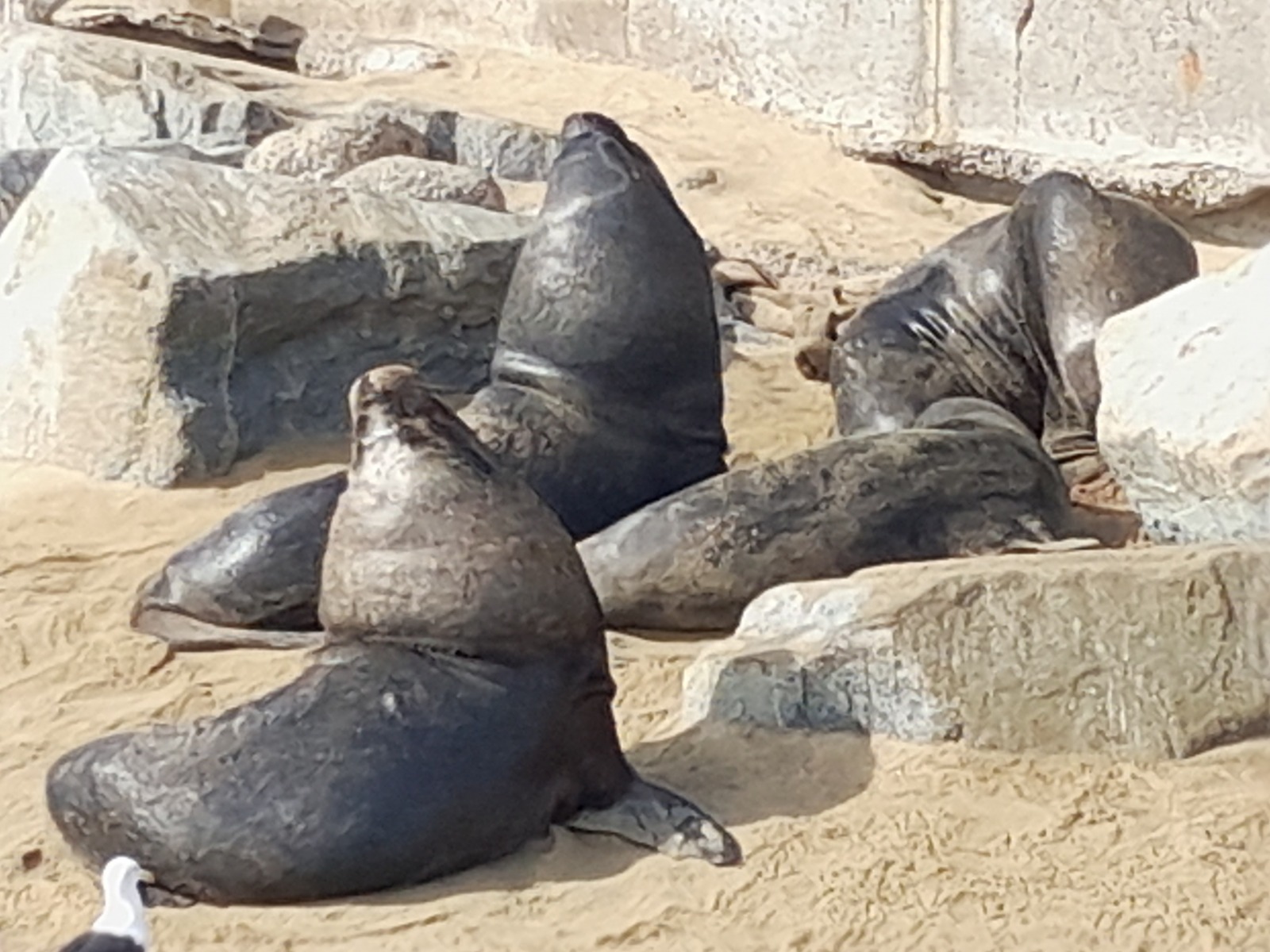 Une erreur de calcul nous a empêché de voir le musée archéologique ; dommage. Nous prenons un bus jusqu’à Valparaiso et avons la bonne idée de laisser nos grosses valises à la consigne de la gare routière… Nous devons reprendre un bus demain. Pour rejoindre le port, nous montons dans le trole. Mais au port nous ne trouvons pas les pélicans que nous recherchons. Il faudra reprendre un petit train jusqu’à la Caleta Portales. C’est un port de pêche et un marché des produits de la mer étonnant, où je ne reconnais pas la moitié des espèces. Nous regrettons de ne pas avoir une cuisine à notre disposition. Une jetée part du marché. Nous nous y aventurons et découvrons une colonie de loups de mer (ou otaries… mais on peut penser que chaque spécimen pèse entre 100 et 300 kilos).