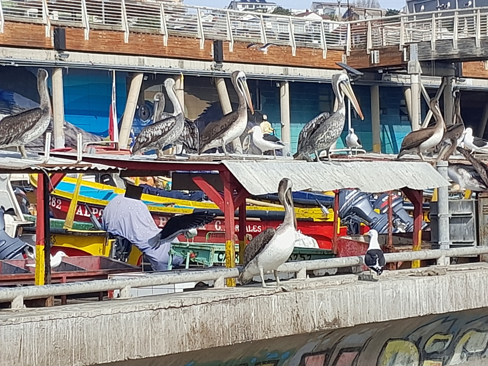 Une erreur de calcul nous a empêché de voir le musée archéologique ; dommage. Nous prenons un bus jusqu’à Valparaiso et avons la bonne idée de laisser nos grosses valises à la consigne de la gare routière… Nous devons reprendre un bus demain. Pour rejoindre le port, nous montons dans le trole. Mais au port nous ne trouvons pas les pélicans que nous recherchons. Il faudra reprendre un petit train jusqu’à la Caleta Portales. C’est un port de pêche et un marché des produits de la mer étonnant, où je ne reconnais pas la moitié des espèces. Nous regrettons de ne pas avoir une cuisine à notre disposition. Une jetée part du marché. Nous nous y aventurons et découvrons une colonie de loups de mer (ou otaries… mais on peut penser que chaque spécimen pèse entre 100 et 300 kilos).