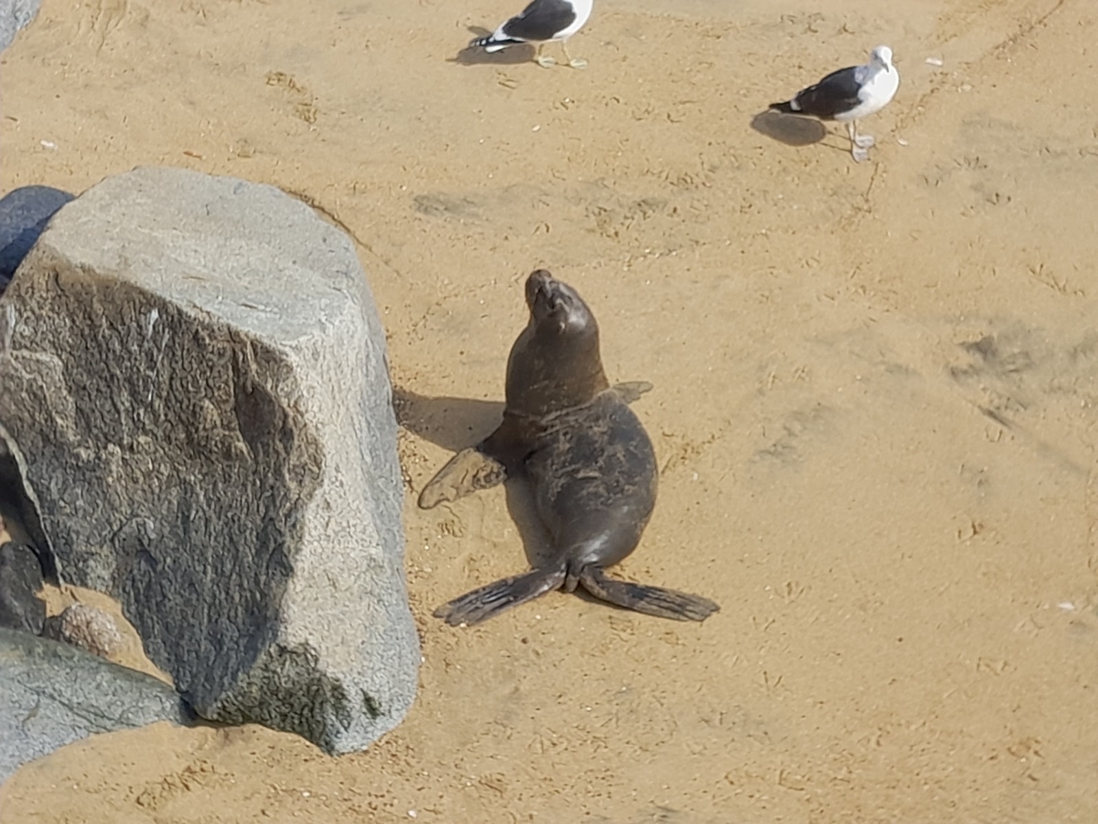 Une erreur de calcul nous a empêché de voir le musée archéologique ; dommage. Nous prenons un bus jusqu’à Valparaiso et avons la bonne idée de laisser nos grosses valises à la consigne de la gare routière… Nous devons reprendre un bus demain. Pour rejoindre le port, nous montons dans le trole. Mais au port nous ne trouvons pas les pélicans que nous recherchons. Il faudra reprendre un petit train jusqu’à la Caleta Portales. C’est un port de pêche et un marché des produits de la mer étonnant, où je ne reconnais pas la moitié des espèces. Nous regrettons de ne pas avoir une cuisine à notre disposition. Une jetée part du marché. Nous nous y aventurons et découvrons une colonie de loups de mer (ou otaries… mais on peut penser que chaque spécimen pèse entre 100 et 300 kilos).