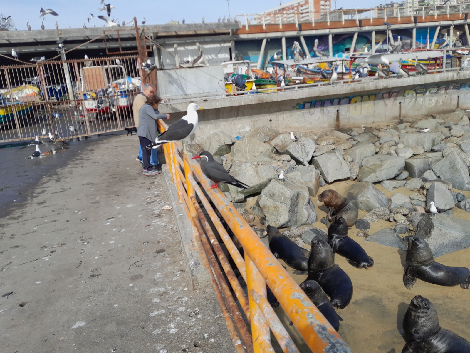 Une erreur de calcul nous a empêché de voir le musée archéologique ; dommage. Nous prenons un bus jusqu’à Valparaiso et avons la bonne idée de laisser nos grosses valises à la consigne de la gare routière… Nous devons reprendre un bus demain. Pour rejoindre le port, nous montons dans le trole. Mais au port nous ne trouvons pas les pélicans que nous recherchons. Il faudra reprendre un petit train jusqu’à la Caleta Portales. C’est un port de pêche et un marché des produits de la mer étonnant, où je ne reconnais pas la moitié des espèces. Nous regrettons de ne pas avoir une cuisine à notre disposition. Une jetée part du marché. Nous nous y aventurons et découvrons une colonie de loups de mer (ou otaries… mais on peut penser que chaque spécimen pèse entre 100 et 300 kilos).