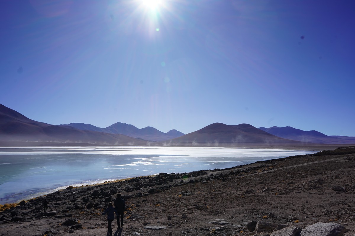 Départ très tôt. Le but est de monter jusqu’à la frontière qui n’ouvrira qu’à 8 heures : le poste frontière de Hito Cajon. En attendant son ouverture nous prenons un petit déjeuner au-dessus de 4000m et avec des températures négatives. Un thé de coca pour gérer la puna. A ce moment, tout va bien. Notre chauffeur me parle de la montagne frontière que nous avons en face de nous : le Licancabur. Il explique l’avoir gravi depuis le côté Bolivien mais qu’on ne peut pas le faire depuis le Chili. En effet, lors de la guerre du Pacifique (1879-1884 quand même) les Chiliens ont miné ce flanc de la montagne et ces mines pourraient encore exploser…