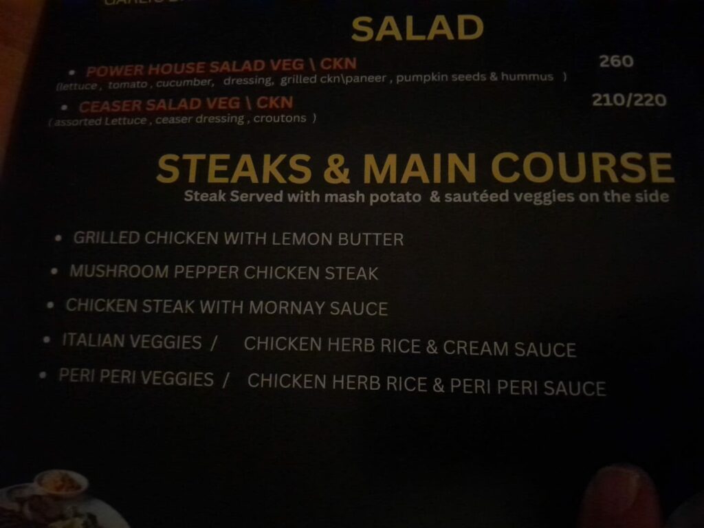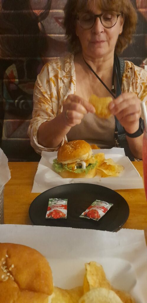 Nous avons craqué ce soir. A Manipal il y a l’embarras du choix en matière de restaurants. Et au lieu des choix North India / South India, ou Veg/Non Veg, nous avons opté pour un hamburger. Comme l’indique bien le menu, ça ne pouvait pas être un hamburger de bœuf.