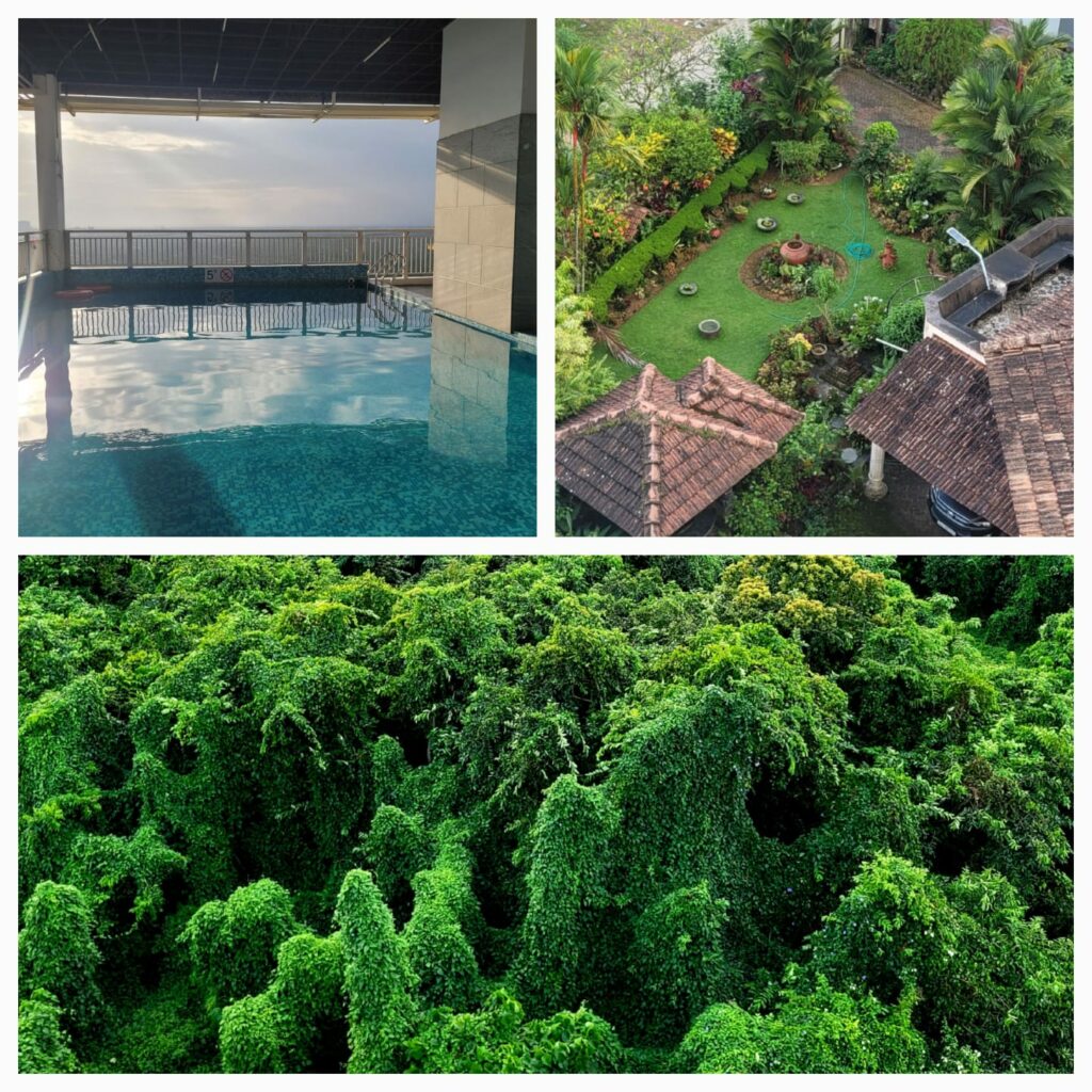 Vue de la piscine de l’hôtel au cinquième étage, d’un côté la canopée et de l’autre un joli jardin